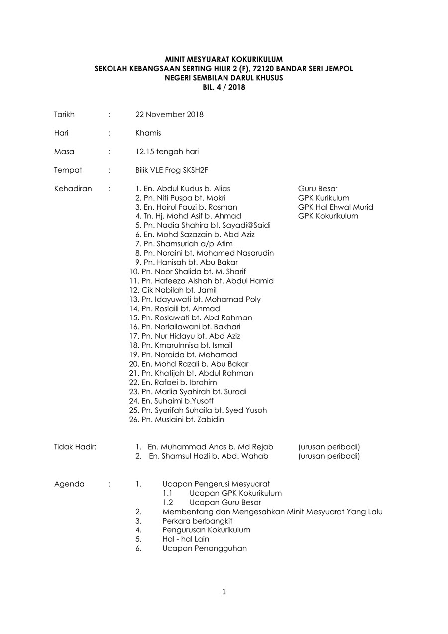 1 minit mesyuarat mesyuarat kokurikulum kali ke 4 tahun 2013 tarikh: 26 disember 2013 11.15 pagi bilik mesyuarat skgn pn noorizah binti shuid guru besar sekolah kebangsaan. Contoh minit mesyuarat agung persatuan. Menghadiri kursus dari semasa ke semasa untuk meningkatkan ilmu dan kemahiran diri. Syukur kepada allah swt kerana sekolah kita telah selamat dirasmikan pada 25 mei yang lalu.